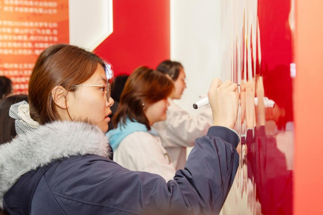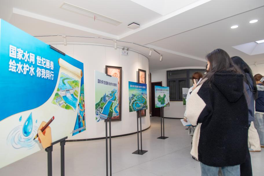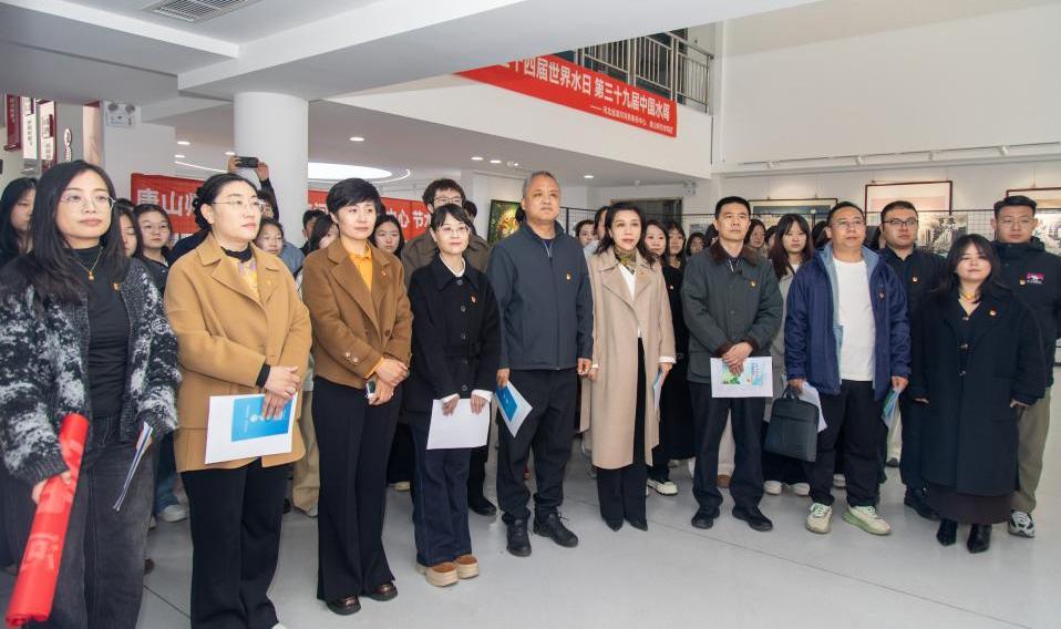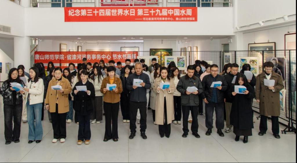 师生党员代表齐聚美育展厅,在“节水倡议活动墙”郑重签名,一笔一画间凝聚着依法节水的思想共识与行动自觉,筑牢依法节水思想共识。随后,全体党员代表集体肃立,以饱满的精神状态齐声诵读《公民节约用水行为规范》与《河北省节约用水条例》,铿锵有力的诵读声在展厅内回荡,将节水法治理念深深烙印在每一位参与者心中。开幕仪式后,参观节水书画展,近百幅精选作品涵盖国画、书法、水彩等多种艺术形式,讲解员用生动的艺术语言向观展群众传递节水护水的深刻内涵,实现了艺术感染力与科普传播力的有机统一。